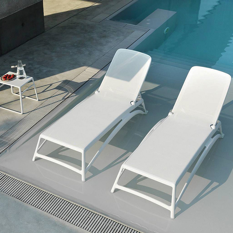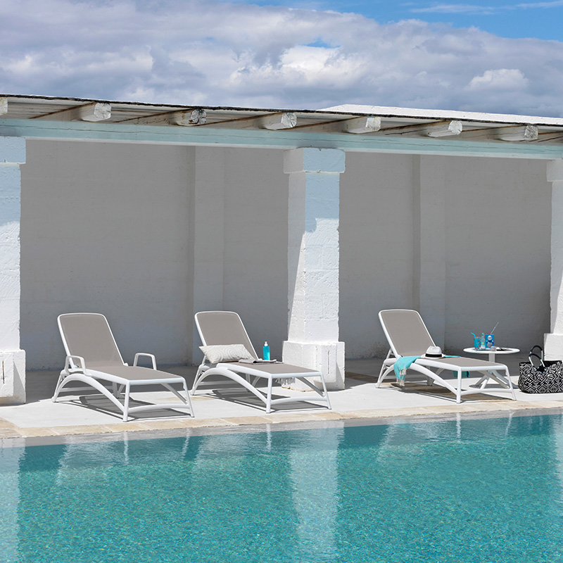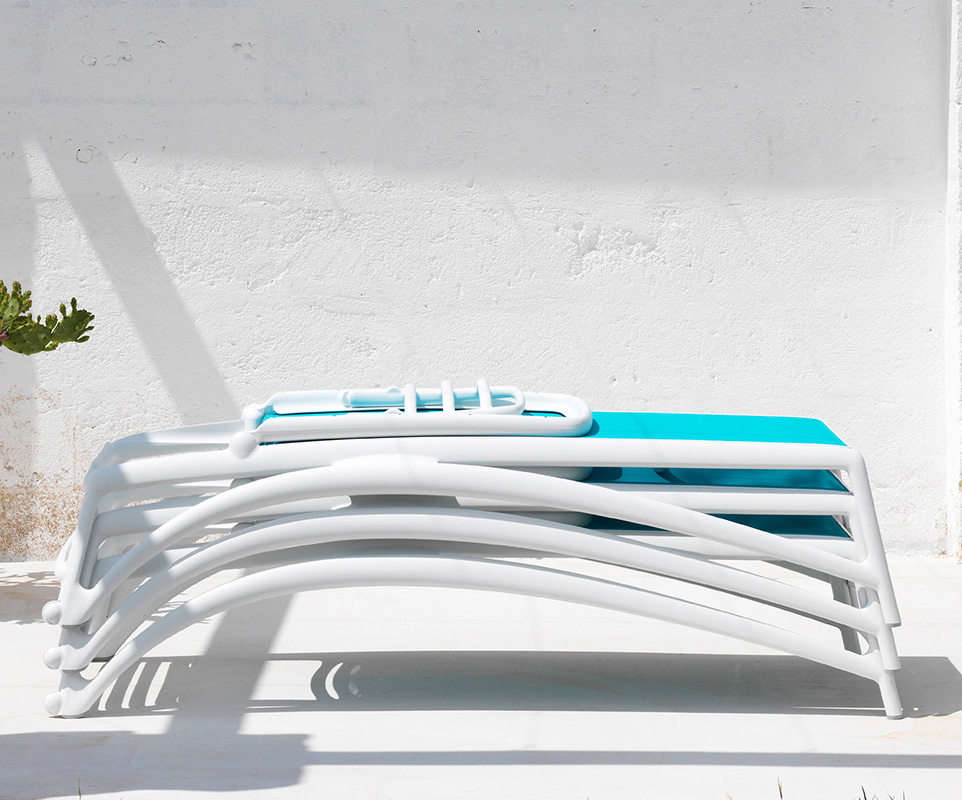 La asoleadora Atlantico apilable, se caracteriza por una estructura exterior tubular en polipropileno fiberglaas, tratado anti-UV y teñido en masa, de la marca NARDI Outdoor.