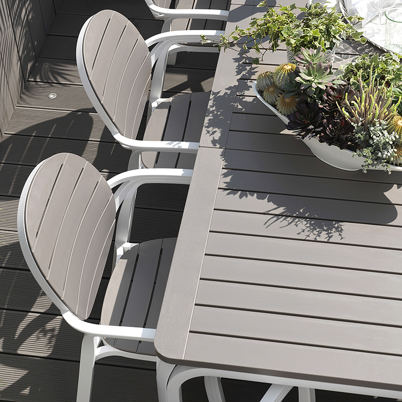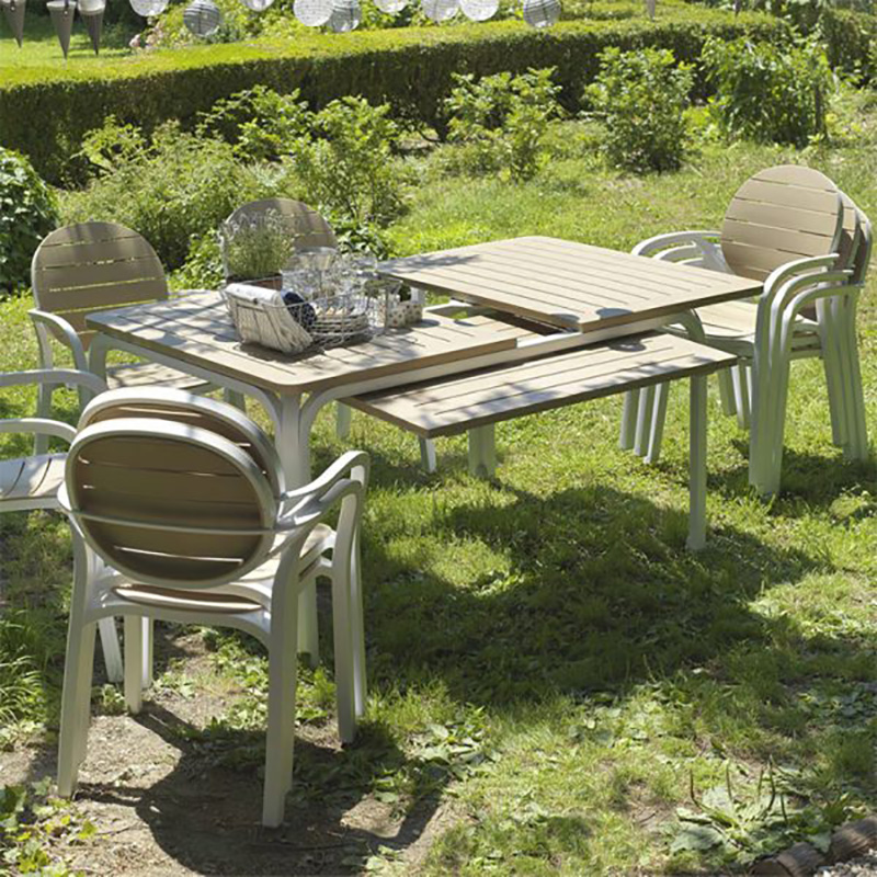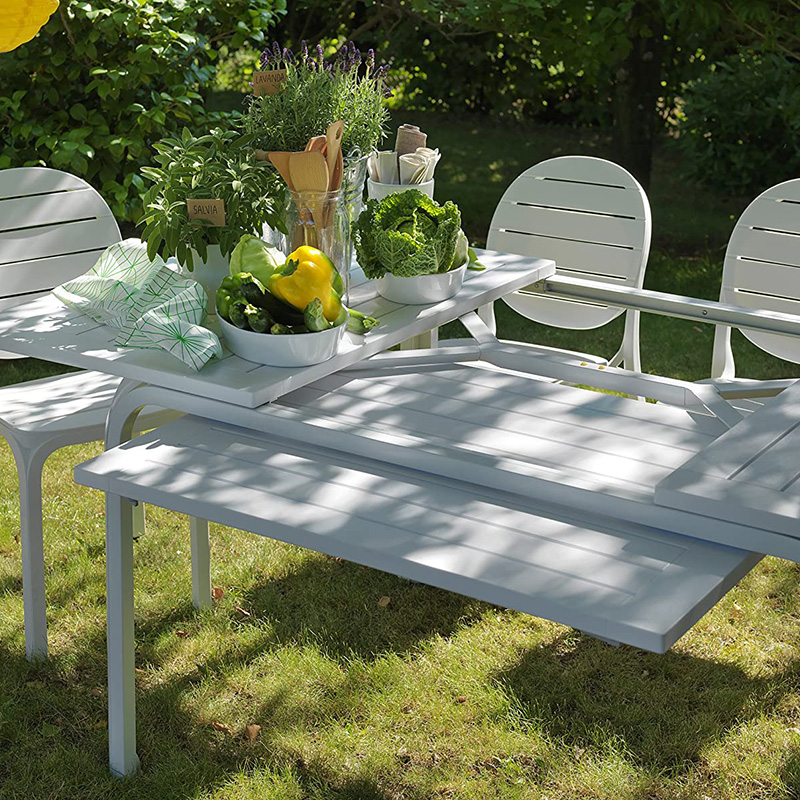 Comedor Alloro elegante de seis (6) puestos con mesa extensible, fabricado en resina de fibra de vidrio, polipropileno. Diseñado especialmente para permanecer al exterior por su resistencia y durabilidad. Compuesto por: