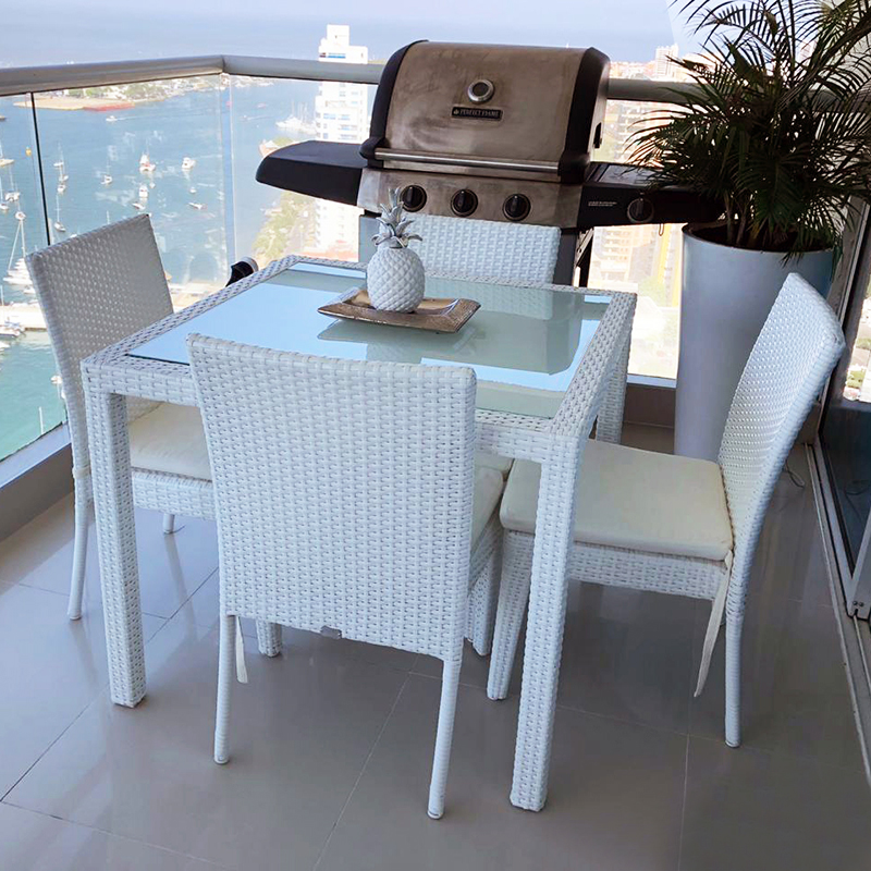 Estos muebles son perfectos para tus espacios exteriores como: Balcones, Terrazas, Patios, Piscinas, entre otros; ya que la fibra sintética tiene el mismo aspecto que la natural, y una gran ventaja que es anti-hongos y anti-bacteriana; además las piezas son más resistentes y durables a la intemperie, (sol y lluvia) incluso al salitre en zonas cercanas al mar y a climas tropicales con altas temperaturas, gracias a que poseen filtro UV.