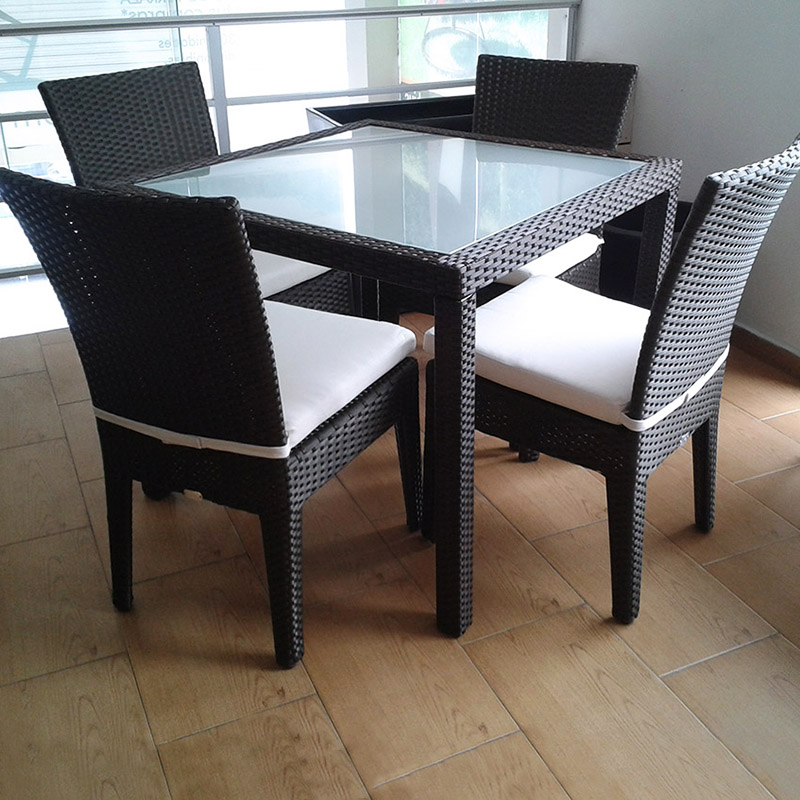 El Comedor Búffalo de (4) cuatro puestos para exteriores está fabricado en estructura de Aluminio, tejido a mano por artesanos en fibra de rattan sintético compuesto por: