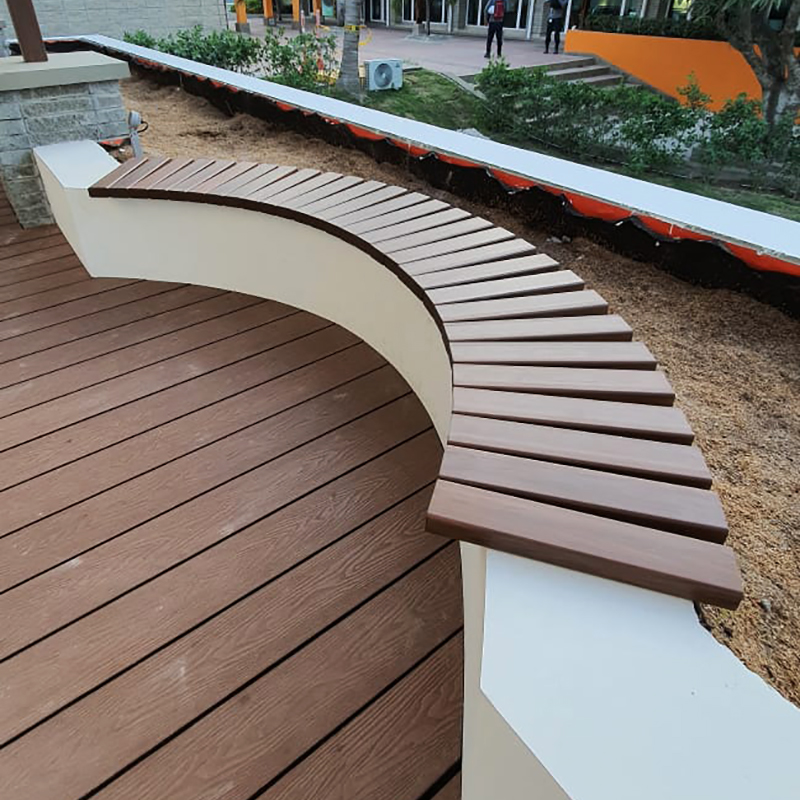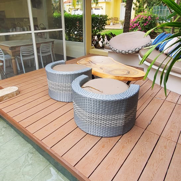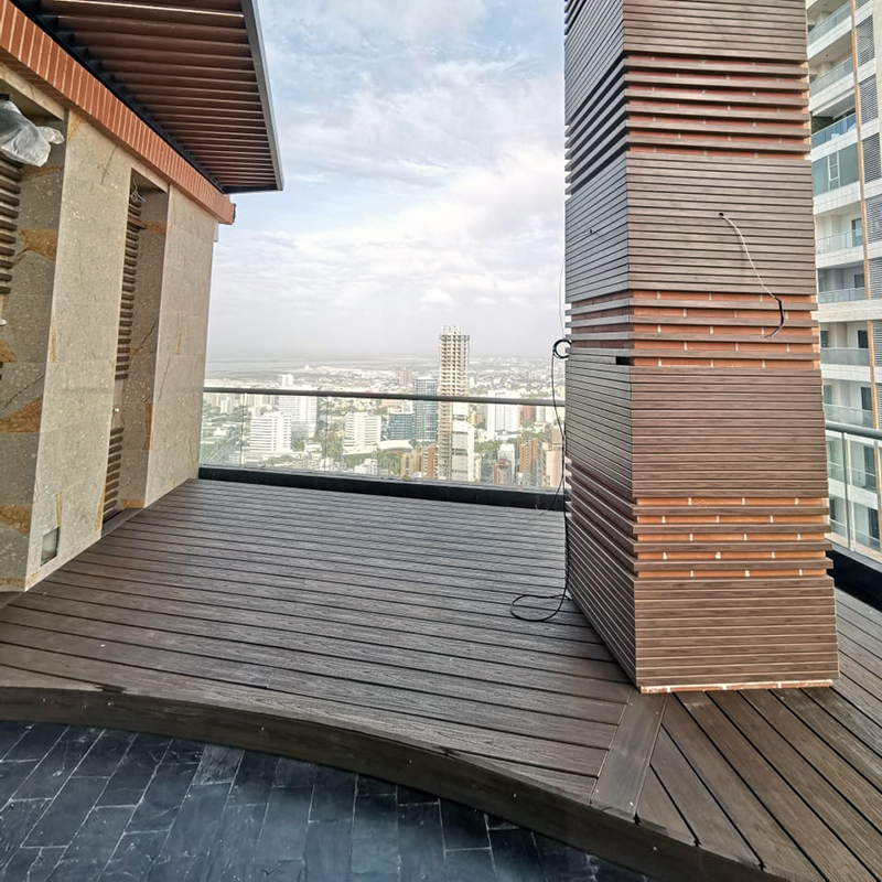 Listones para deck con bordes cuadrados o ranurados para tener acabados sin astillas, suave al tacto, ofrece una sensación de confort bajo sus pies y de aspecto y textura de la madera natural. Asegurados a estructura por medio de tornillería y clips. Soporte para deck en tubería de aluminio asegurado con pernos de anclaje.