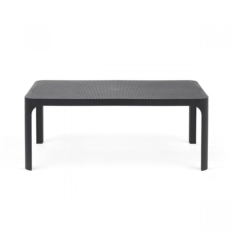 Mesa Net auxiliar baja, de superficie rectangular con textura perforada. Es el complemento perfecto para armar una sala junto con la banca y la poltrona Net. Ideal para exterior pero perfecta también como complemento en la decoración de interior.