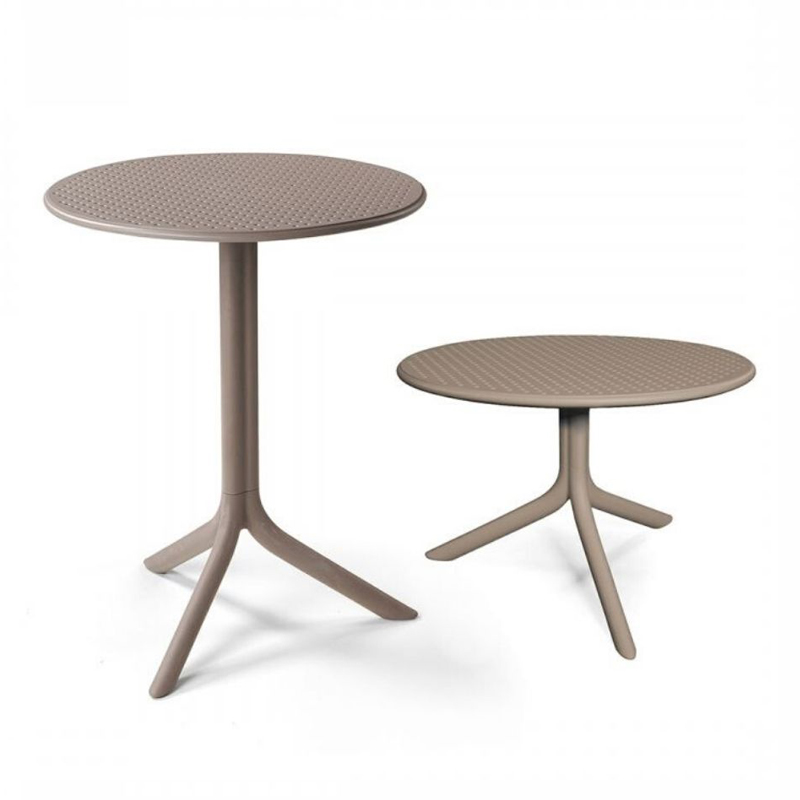 Mesa Spritz auxiliar de superficie redonda y base de tres patas, ideal para exterior pero perfecta también como complemento en la decoración de interior. Diseñada para adaptarse a dos alturas. Está hecha en resina de fibra de vidrio, polipropileno tratado anti UV, pintada efecto mate con tapones antideslizantes. De la marca NARDI Outdoor.