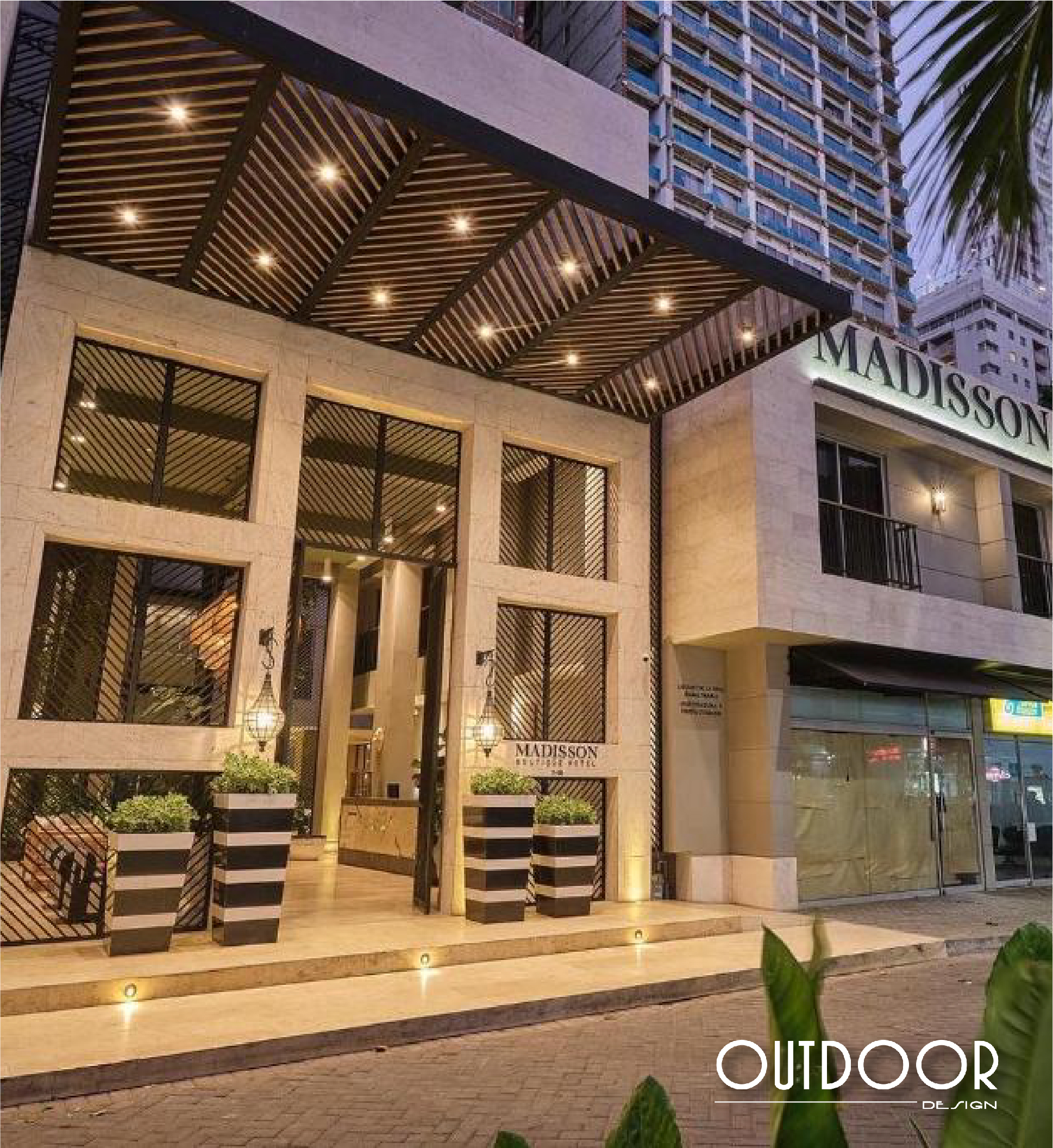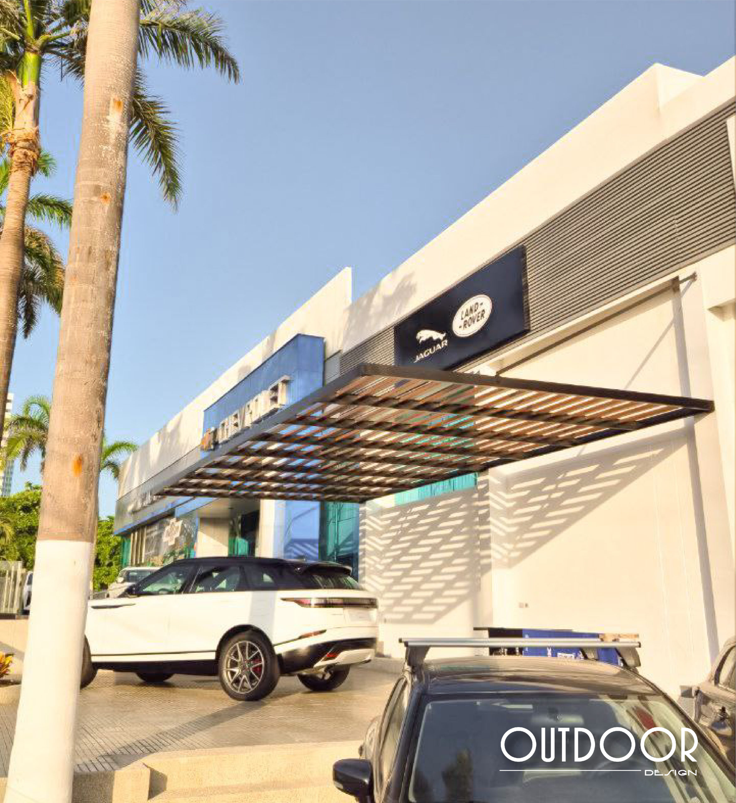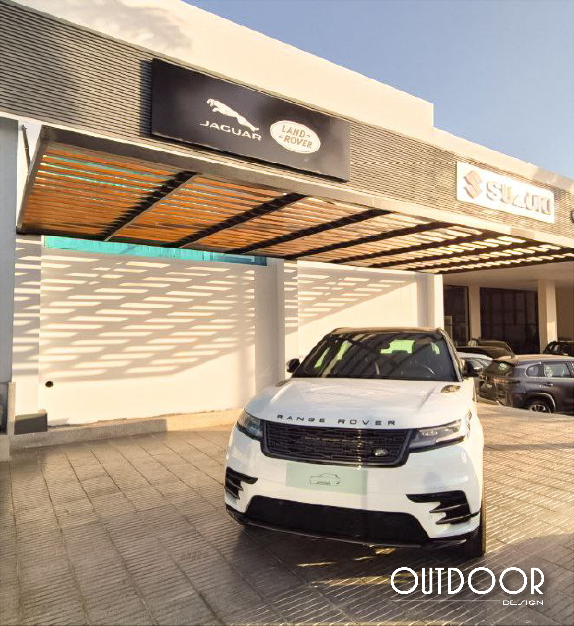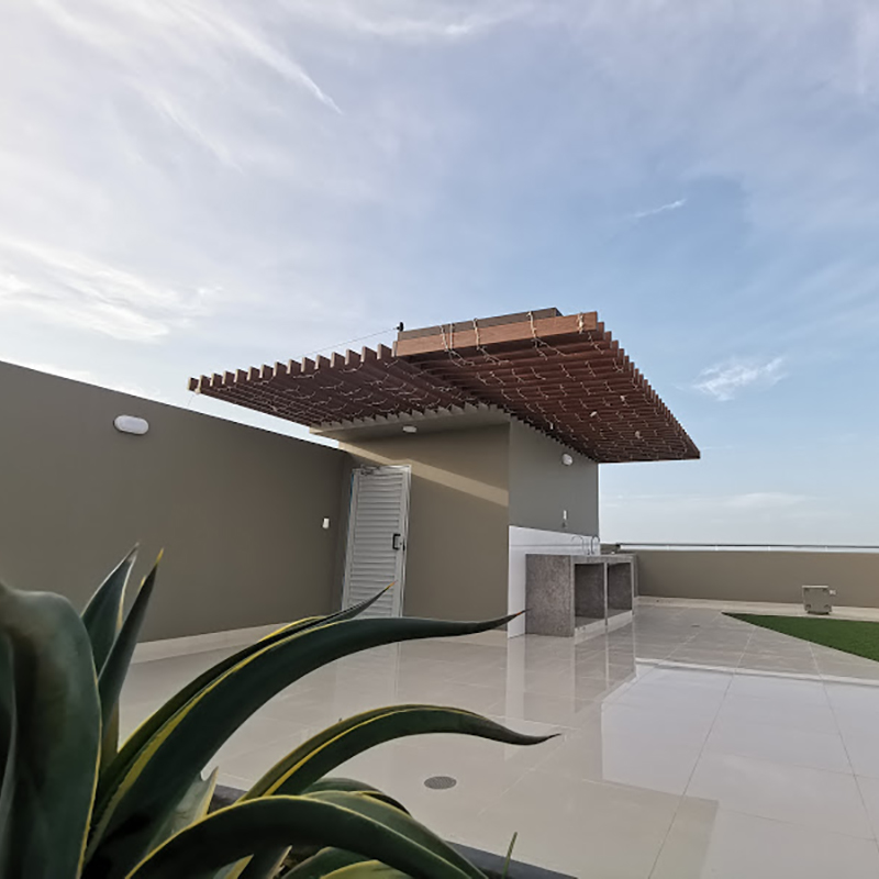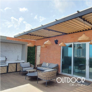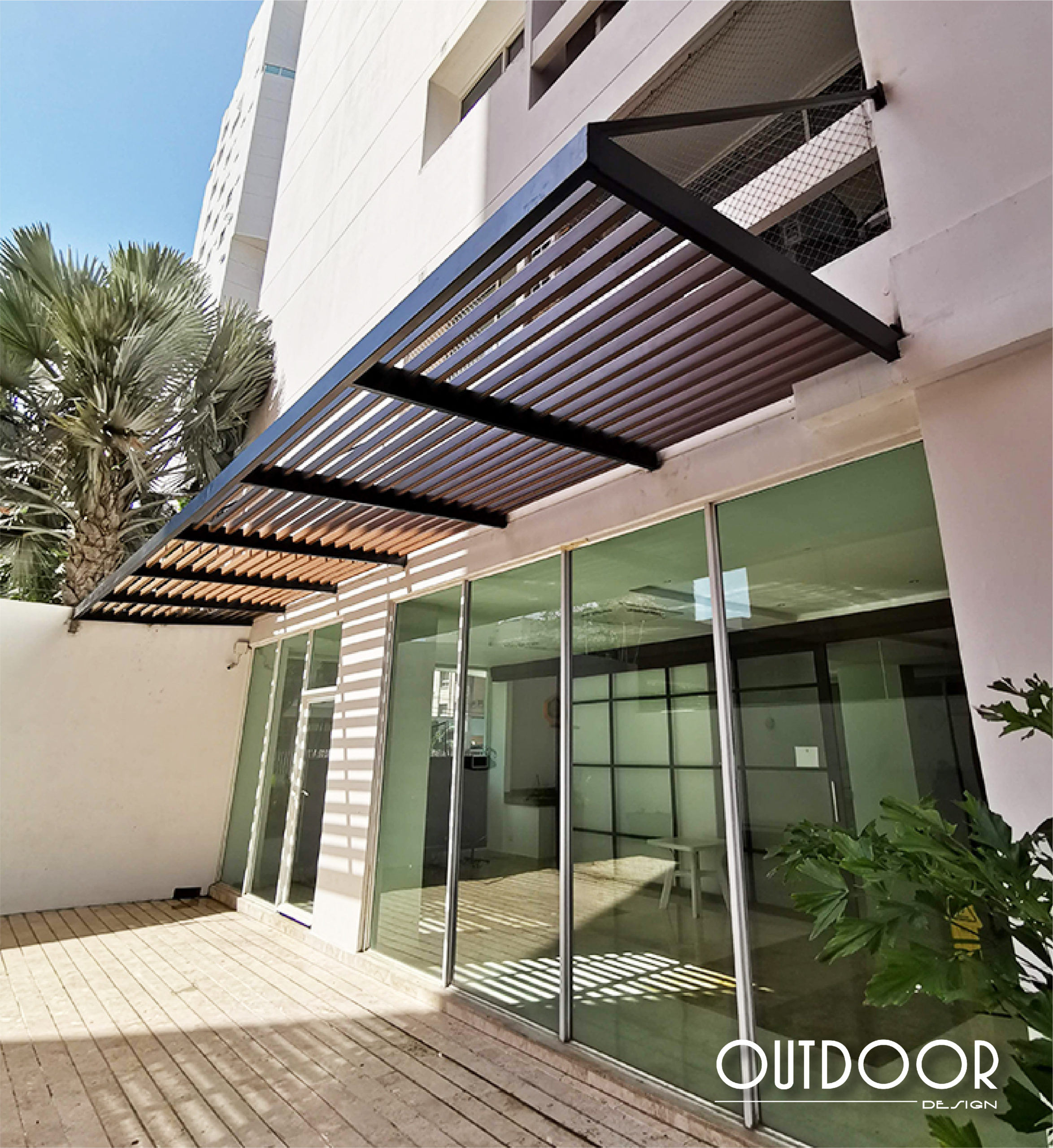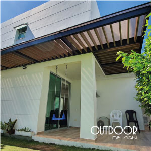 Pérgola con tensores en perfilería tubular rectangular o cuadrada de PVC, extruida texturizada tipo madera natural color a elección; con estructura metálica galvanizada, o aluminio, acabado en pintura electrostática colgada a vigas con tensores.