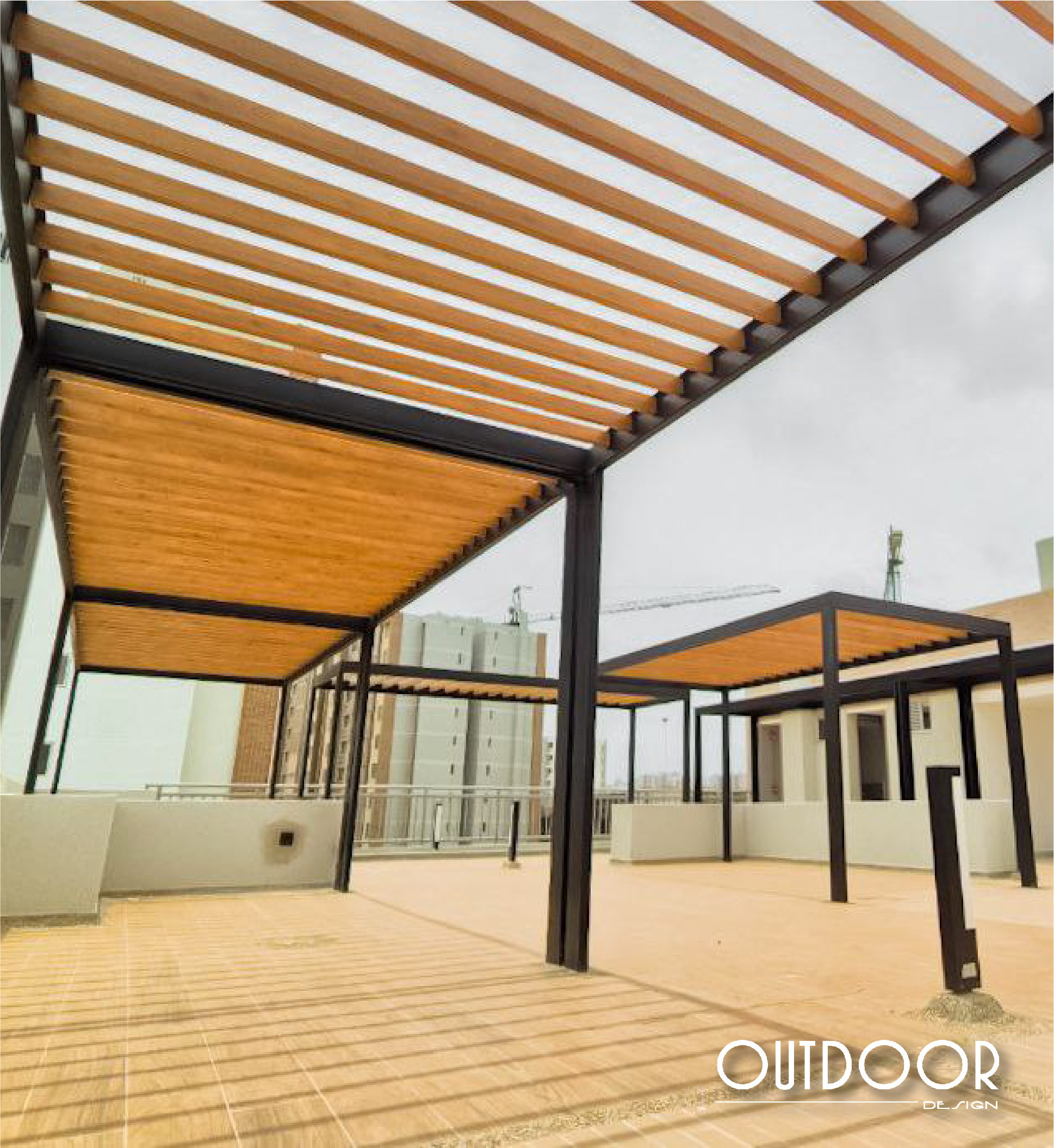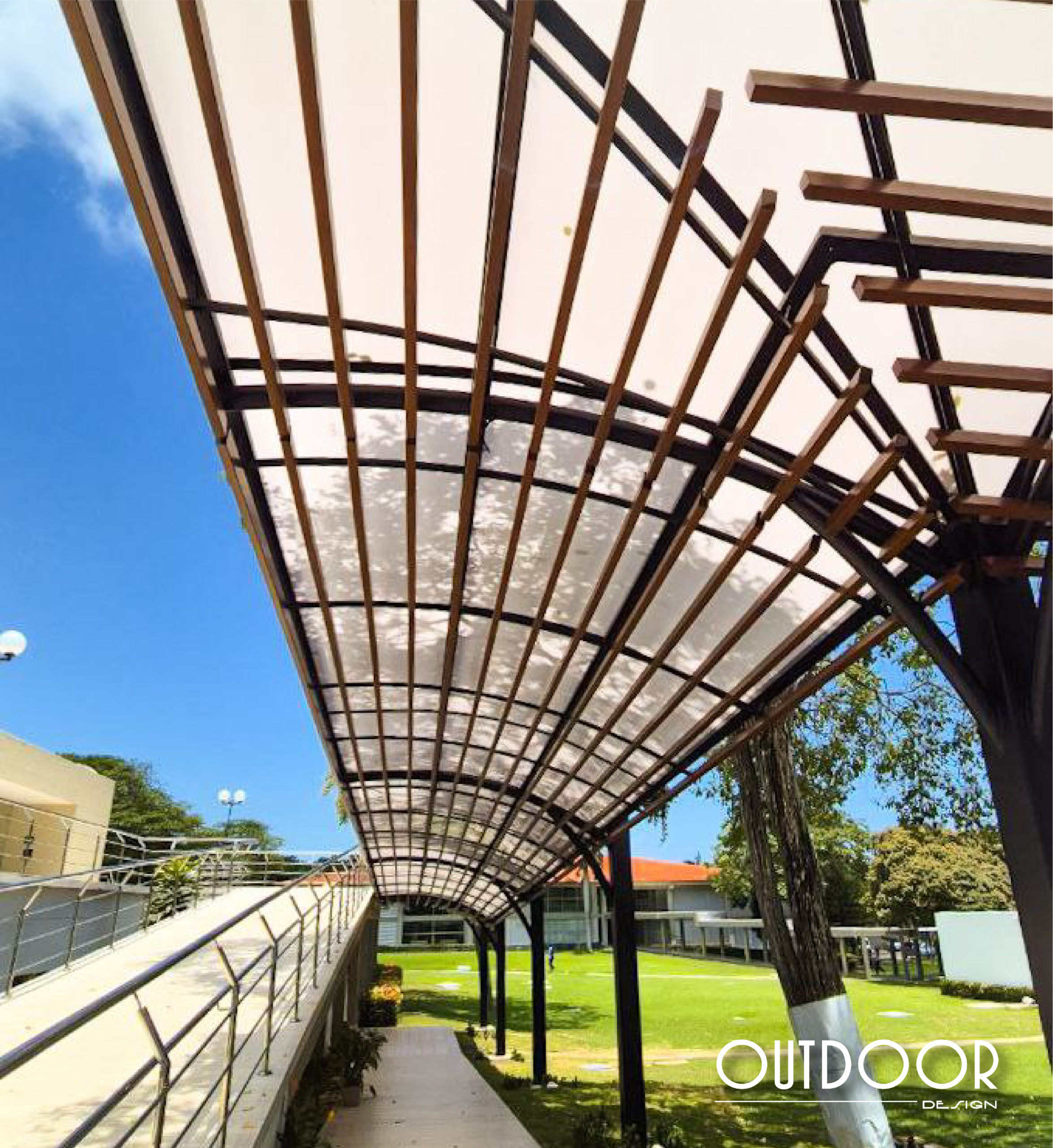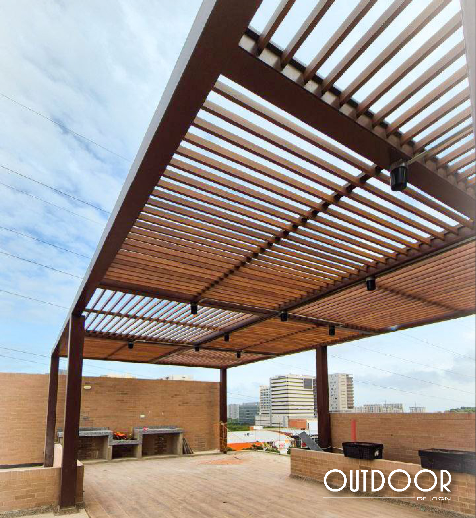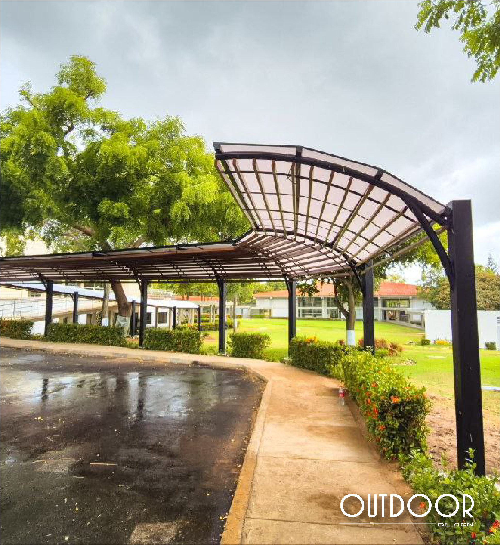 Pérgola en PVC con columnas, su estructura es en perfilería tubular, rectangular o cuadrada; soportada en columnas de estructura metálica galvanizada en caliente, con acabado en pintura electrostática. Además puede ir con o sin cubierta en policarbonato macizo o alveolar de color a elección; o vidrio templado.