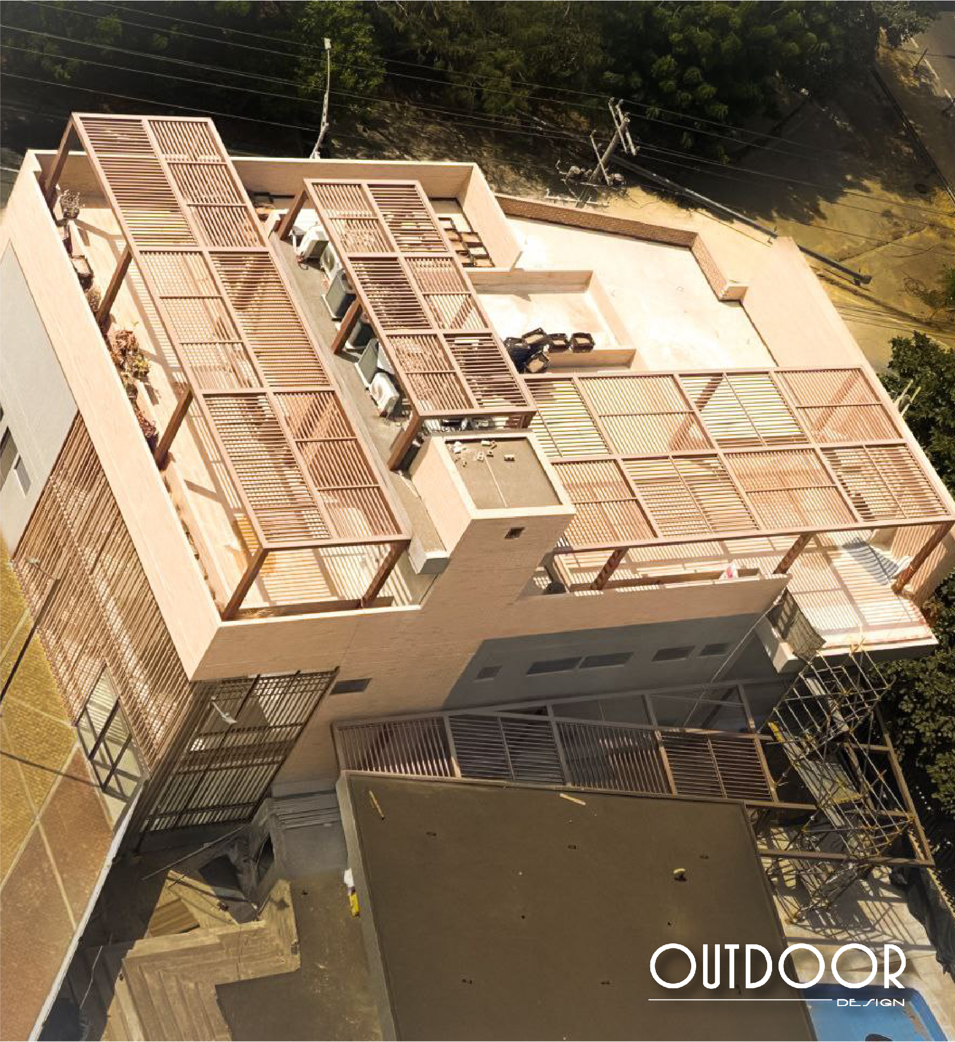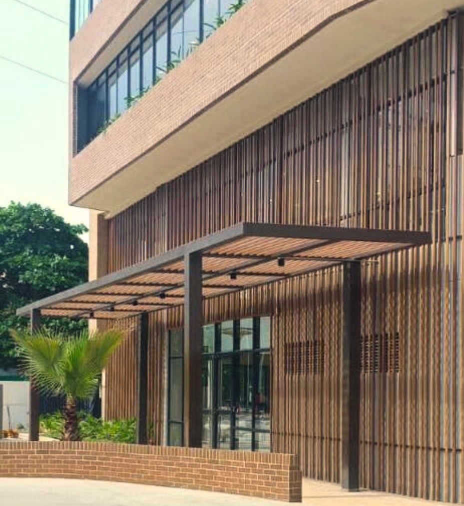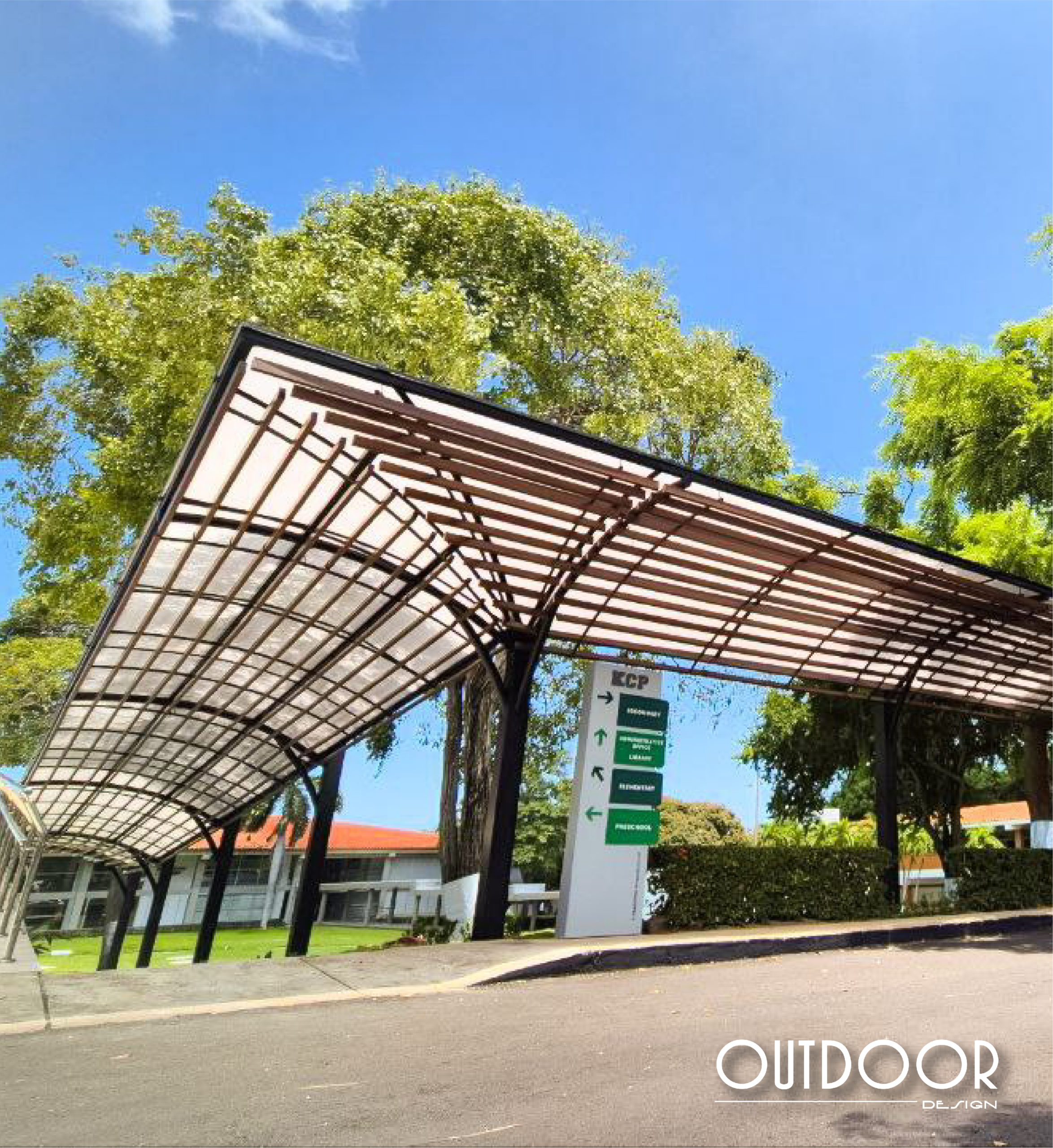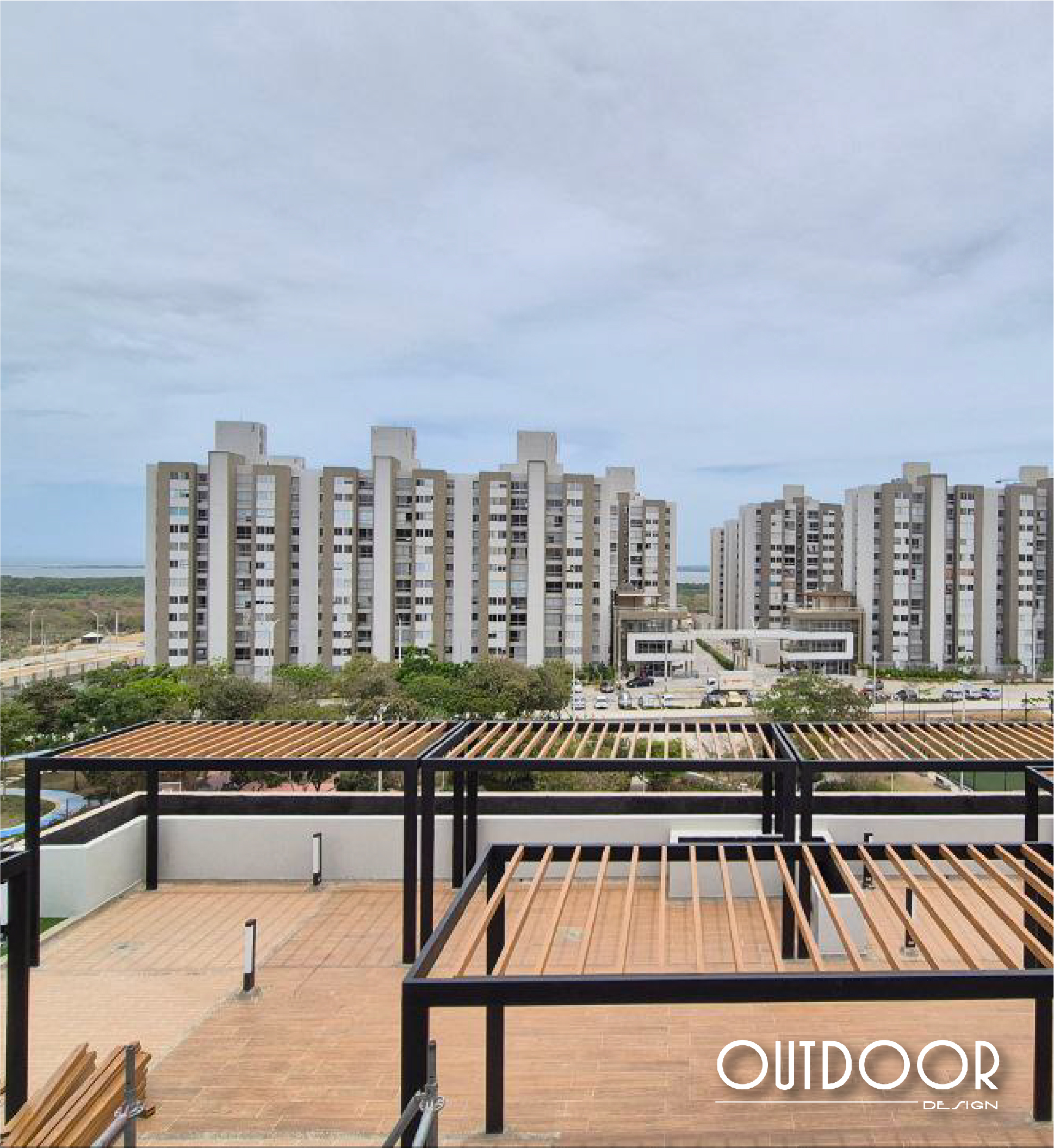 Pérgola en PVC con columnas, su estructura es en perfilería tubular, rectangular o cuadrada; soportada en columnas de estructura metálica galvanizada en caliente, con acabado en pintura electrostática. Además puede ir con o sin cubierta en policarbonato macizo o alveolar de color a elección; o vidrio templado.