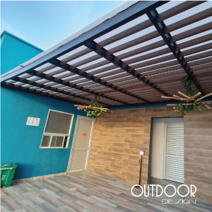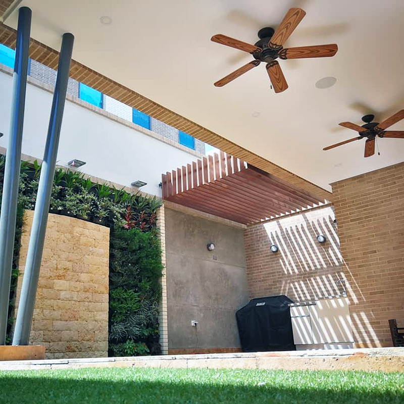 Pérgola entre Muros en perfilería tubular, rectangular o cuadrada de PVC, extruida texturizada tipo madera natural color a elección. Con marco estructural metálico galvanizado en caliente y acabado en pintura electrostática. asegurado a muros existentes por medio de platinas y tornillería de anclaje.