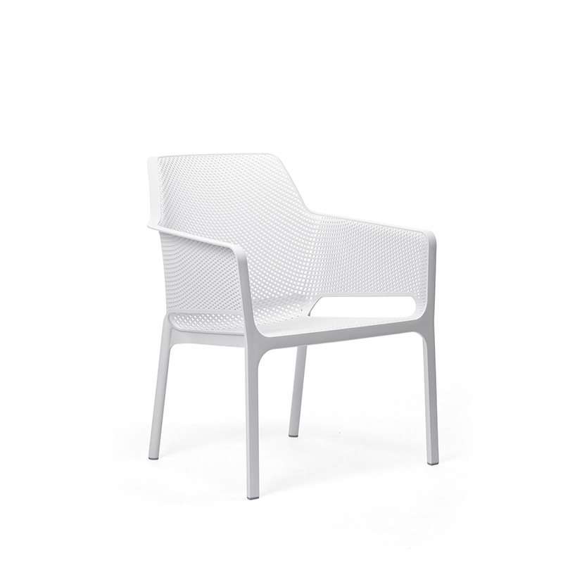 La poltrona Net relax está hecha en una sola pieza, su diseño contiene pequeñas perforaciones cuadrados y rayados distribuidos con continuidad en el espaldar y los brazos.