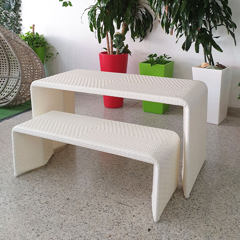 Estos muebles son perfectos para tus espacios exteriores como: Balcones, Terrazas, Patios, Piscinas, entre otros; ya que la fibra sintética tiene el mismo aspecto que la natural, y una gran ventaja que es anti-hongos y anti-bacteriana; además las piezas son más resistentes y durables a la intemperie, (sol y lluvia) incluso al salitre en zonas cercanas al mar y a climas tropicales con altas temperaturas, gracias a que poseen filtro UV.