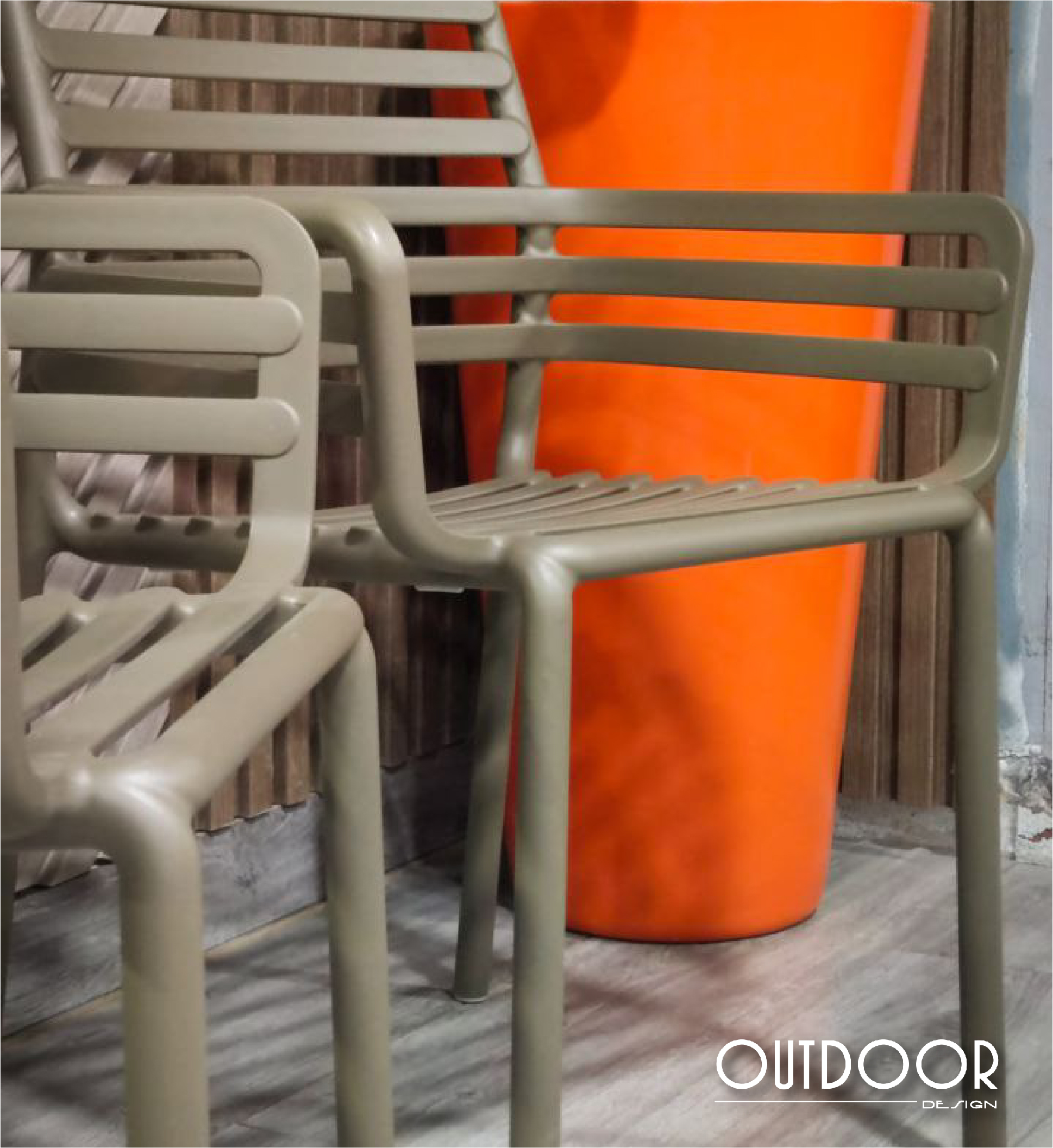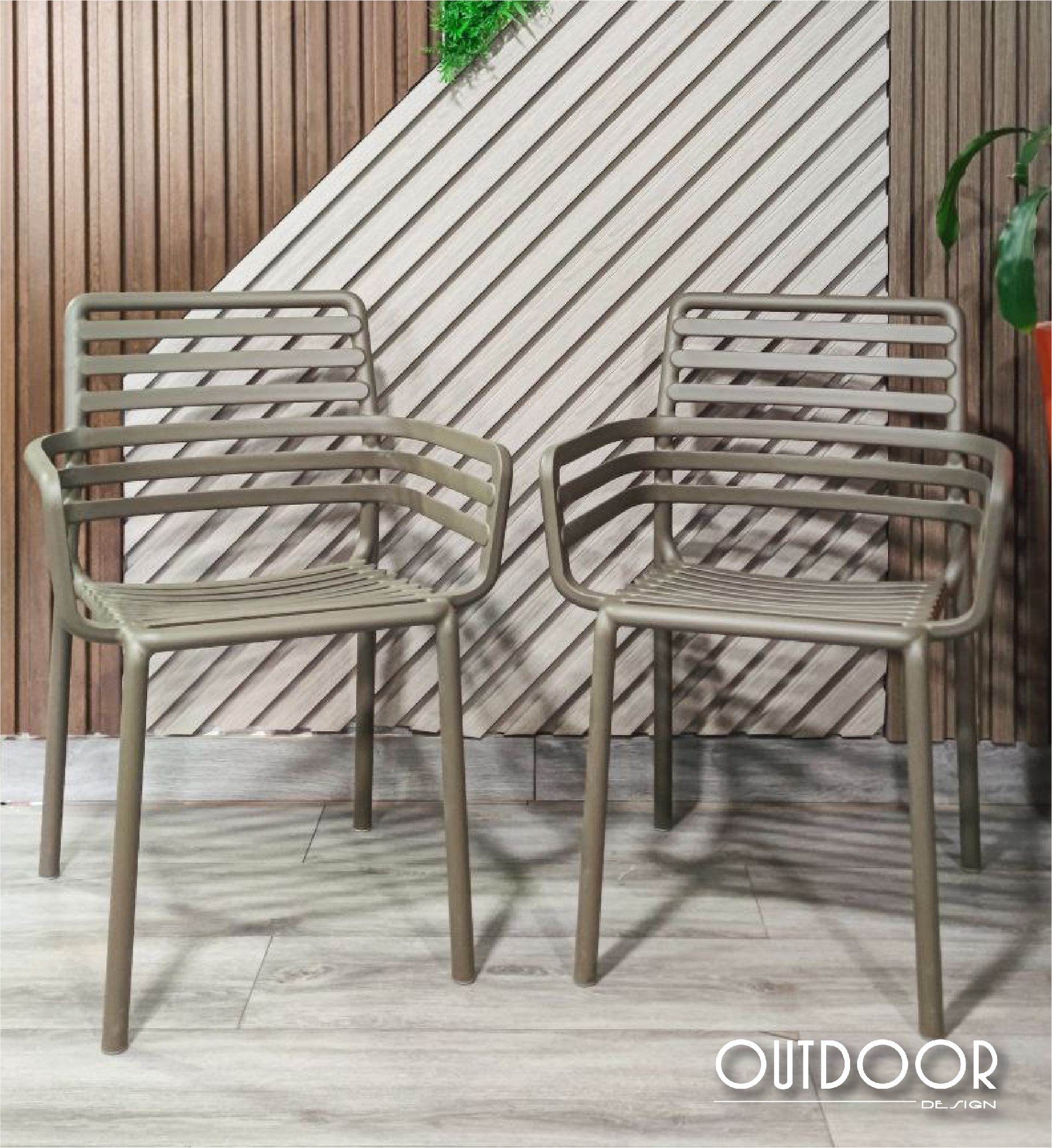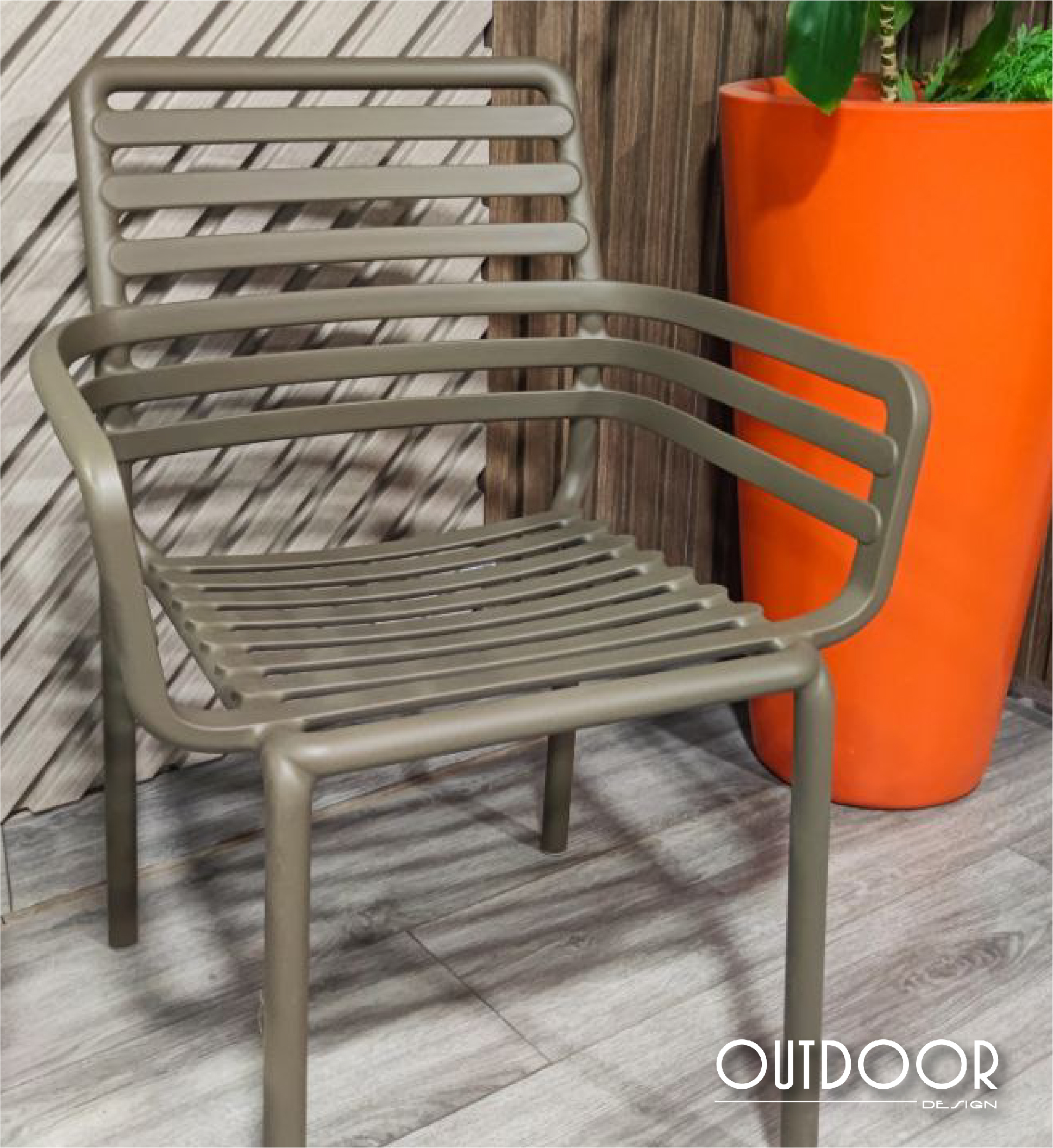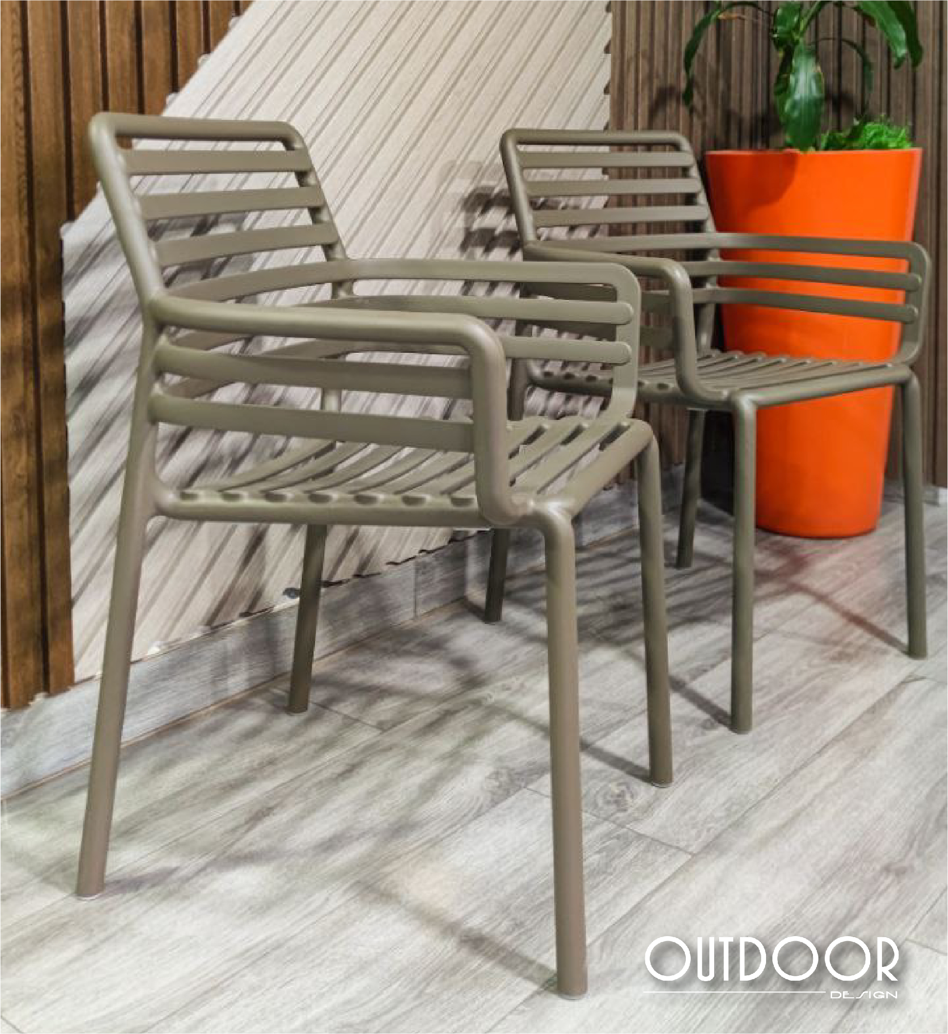 Silla Doga Armchair ligera y apilable con brazos, con diseño de lamas curvas y respaldo calado. Fabricado en resina reforzada con fibra de vidrio y polipropileno, tratado anti-UV y acabado mate. Incorpora tapones antideslizantes y es ideal para exteriores gracias a su resistencia a la intemperie y facilidad de mantenimiento.