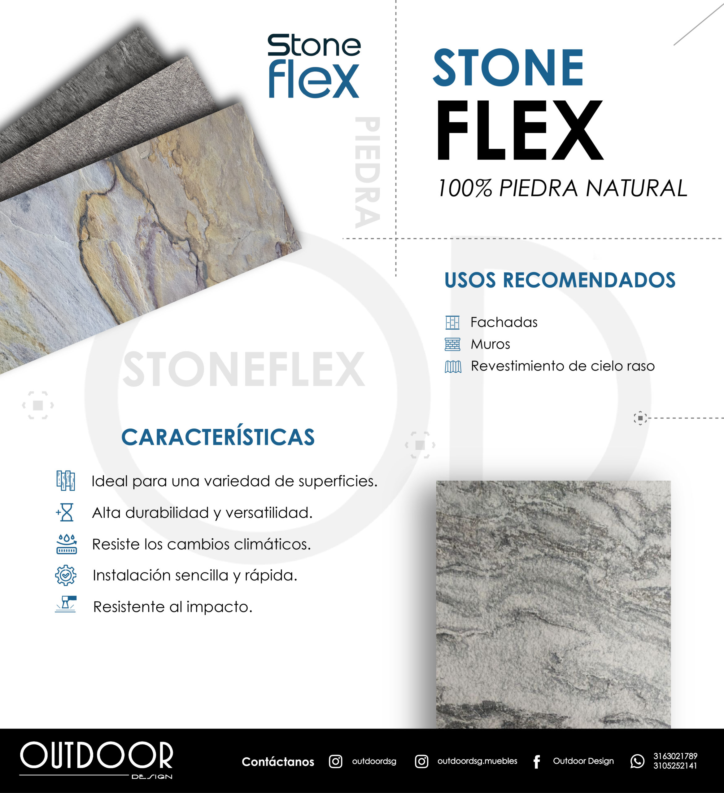 STONEFLEX, revestimiento fabricado a partir de piedra natural ligera y flexible, como cuarcita o pizarra. Este material es ideal para una amplia variedad de superficies, con tecnología avanzada que ofrece productos duraderos y versátiles. Con una GARANTÍA de 10 años.