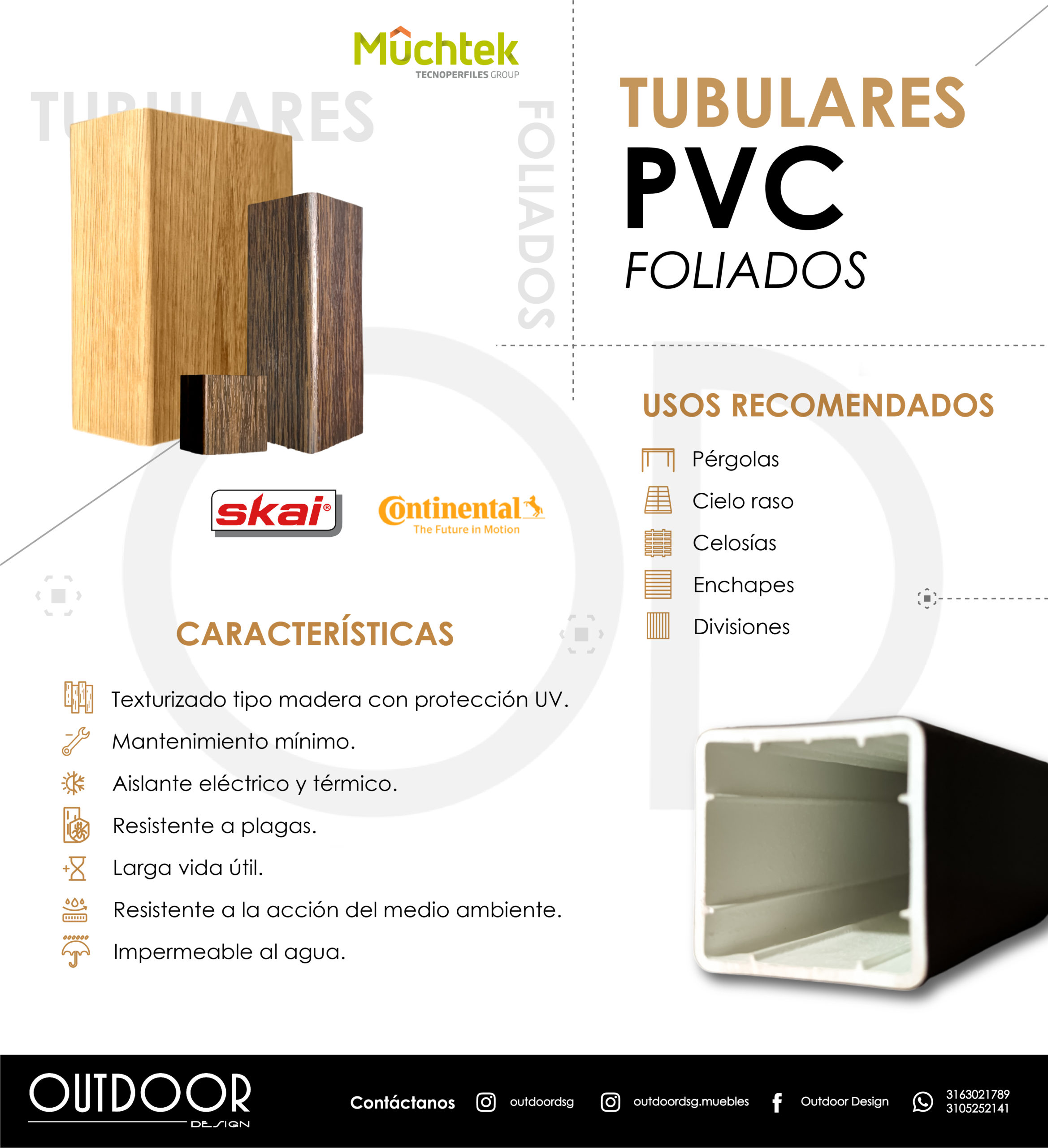 USOS TUBULARES EN PVC FOLIADO: Pérgolas, Corta soles, Divisiones, Cielo rasos, Celosías, Fachadas, Portones y puertas, Cerramientos, Enchapes.