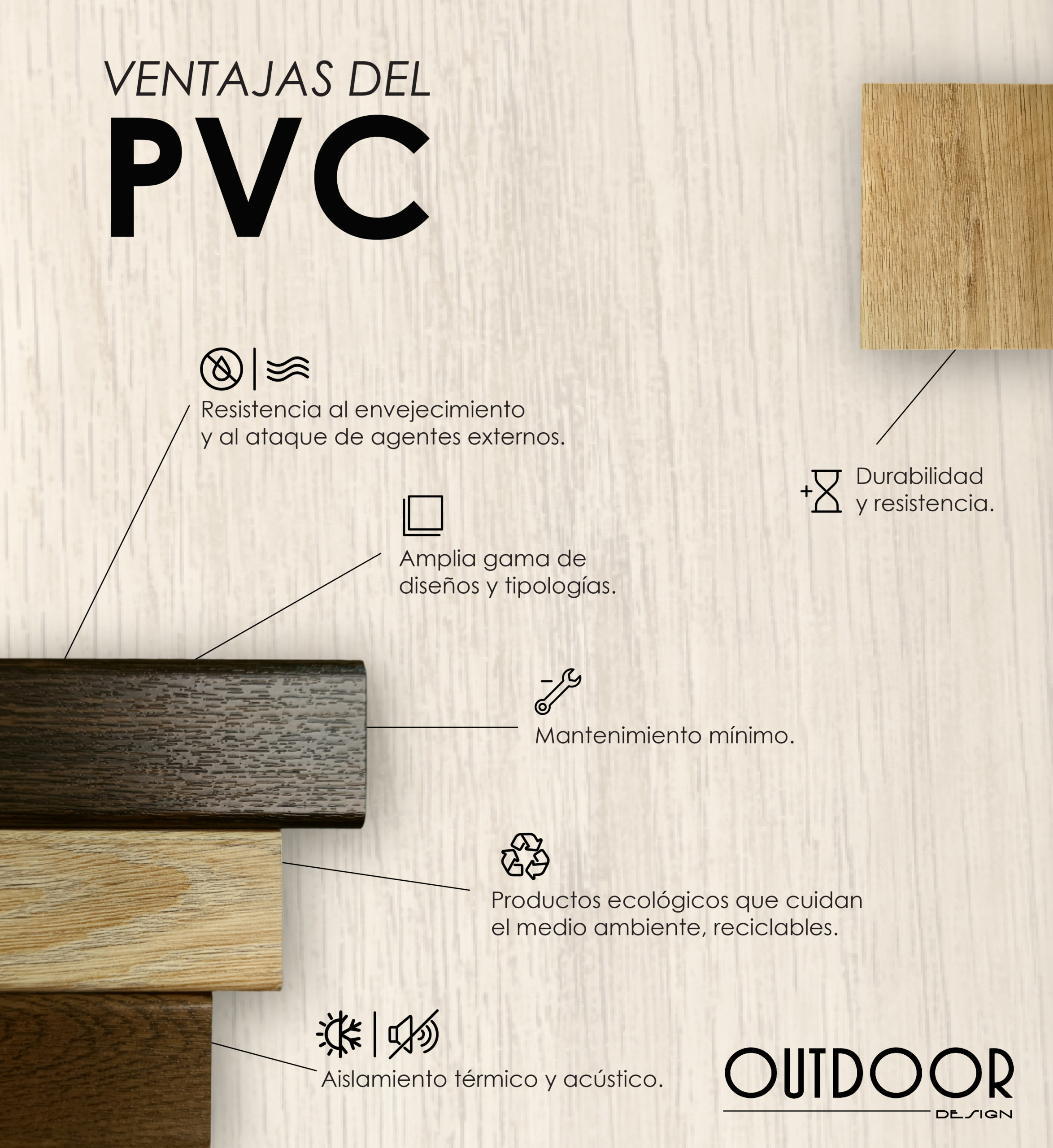 VENTAJAS: Larga durabilidad, no se corroe, pudre ni astilla, es ignífugo y autoextinguible, PVC reciclable. No lo afectan hongos ni termitas. Requiere cero mantenimiento, y ofrece aislante eléctrico y térmico, así como protección solar. Adaptable a cada estilo.